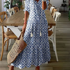 Entdecken Sie den wahren Charme dieses eleganten, langen Boho-Kleides, das aus einem weichen und atmungsaktiven Stoff gefertigt ist und Ihnen den ganzen Tag über optimalen Komfort bietet. Sein romantischer V-Ausschnitt und die anmutige Silhouette verleihen ihm einen femininen und freien Touch, perfekt für lässige Ausflüge ebenso wie für besondere Anlässe. Mit seinem fließenden Fall und der leichten Textur betont es alle Körperformen. Sein lässiger, aber raffinierter Stil macht es zur idealen Wahl für diejenigen, die den Boho-Chic mit einem Hauch von Raffinesse lieben. Kombinieren Sie es mit Sandalen für einen lässigen Look oder kleiden Sie es mit Absätzen und Accessoires für einen Abend auf.