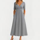 Erweitern Sie Ihre Garderobe: Dieses schicke Midikleid mit V-Ausschnitt ist Ihr Verbündeter für zeitlosen Stil und mühelose Raffinesse.
